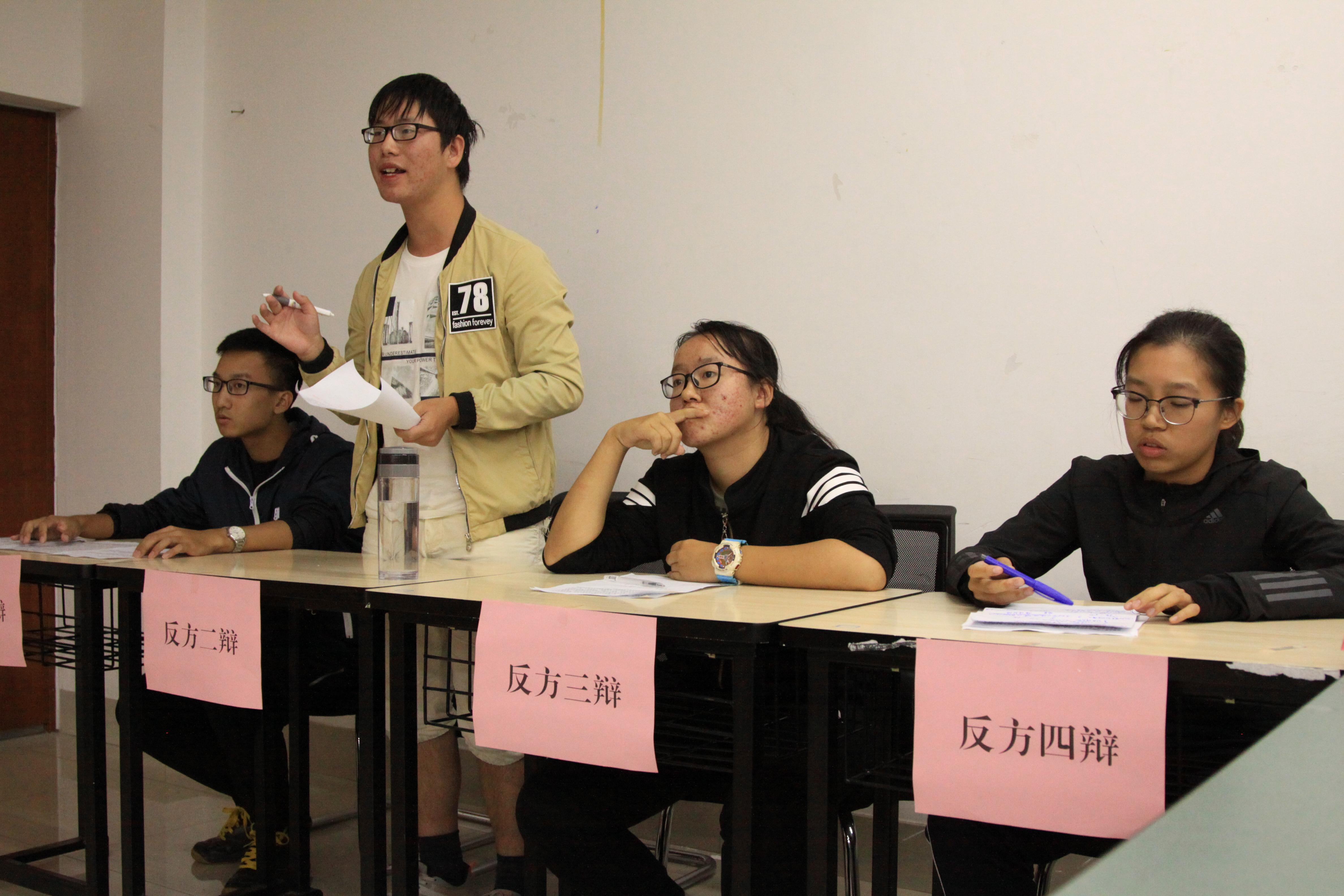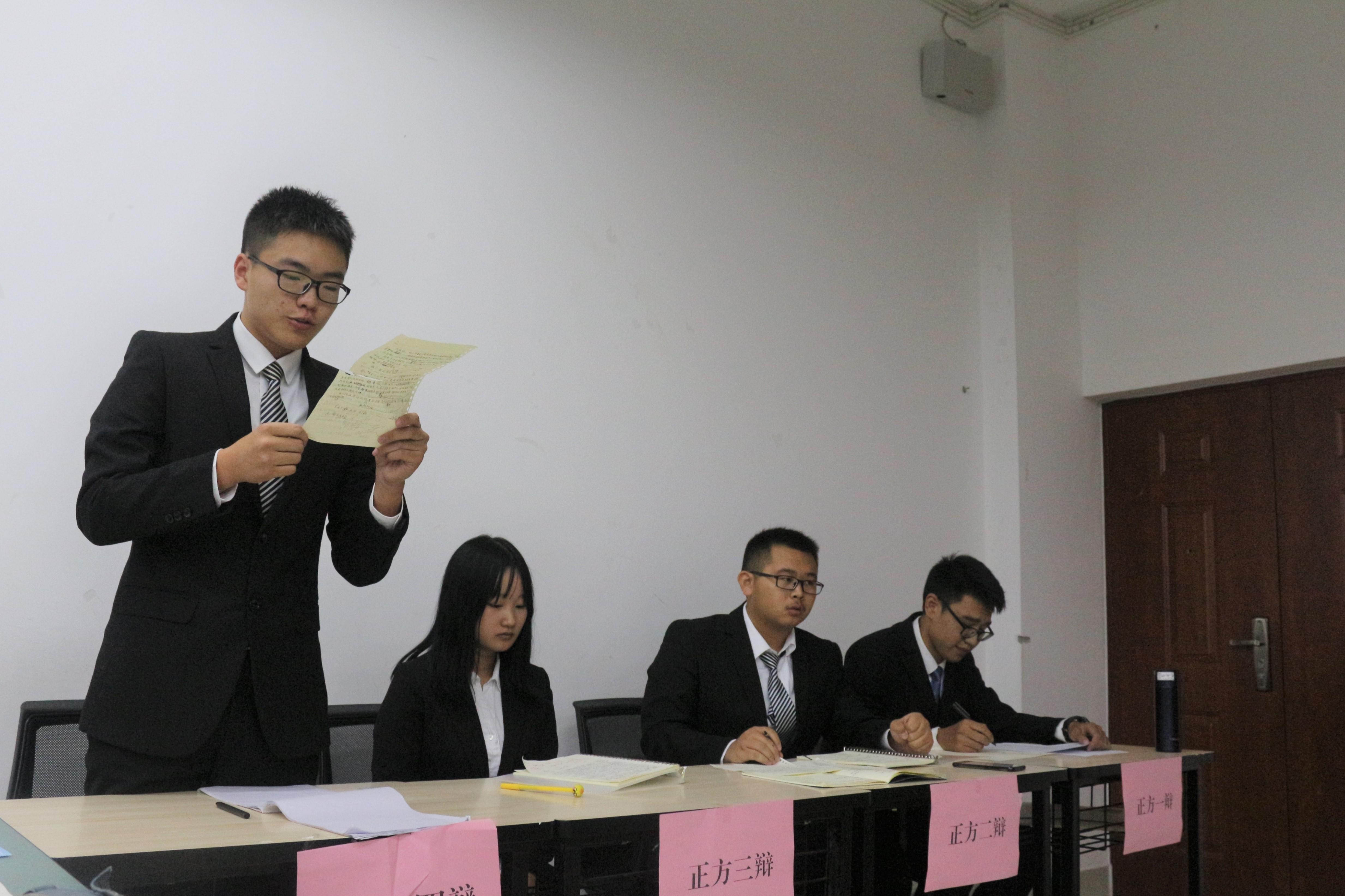 主席陈潭升;出席评委有校辩论队队长佟朗,网飞猫