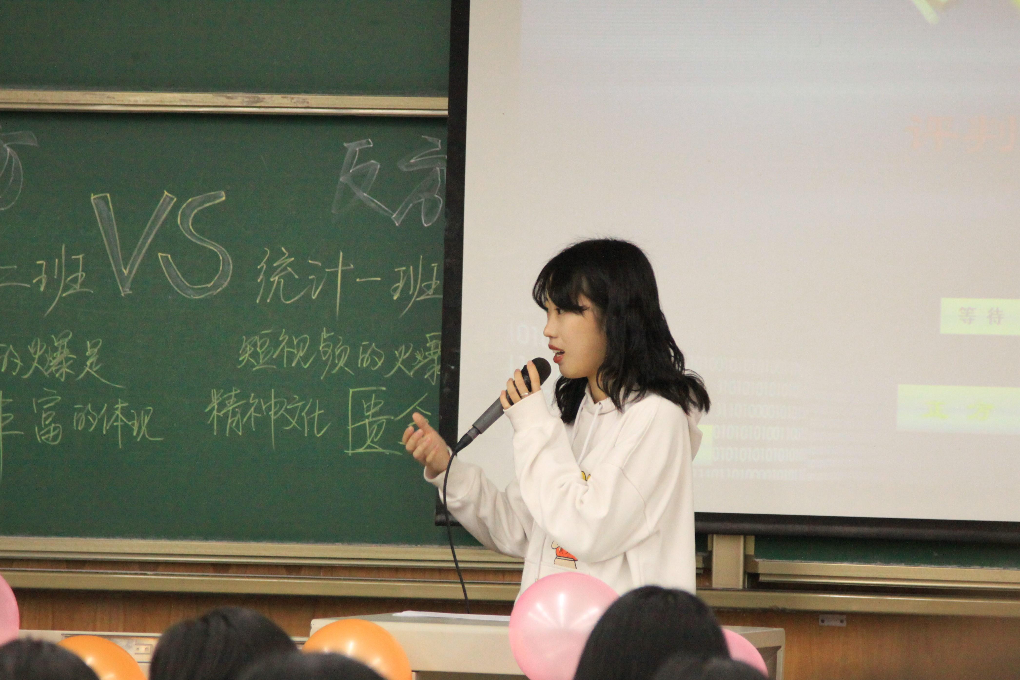 本次精彩的辩论赛正方是数学二班,反方是统计一班,他们以短视频的火爆是精神文化丰富的体现还是精神文化缺乏的体现为辩题,展开激烈辩论。