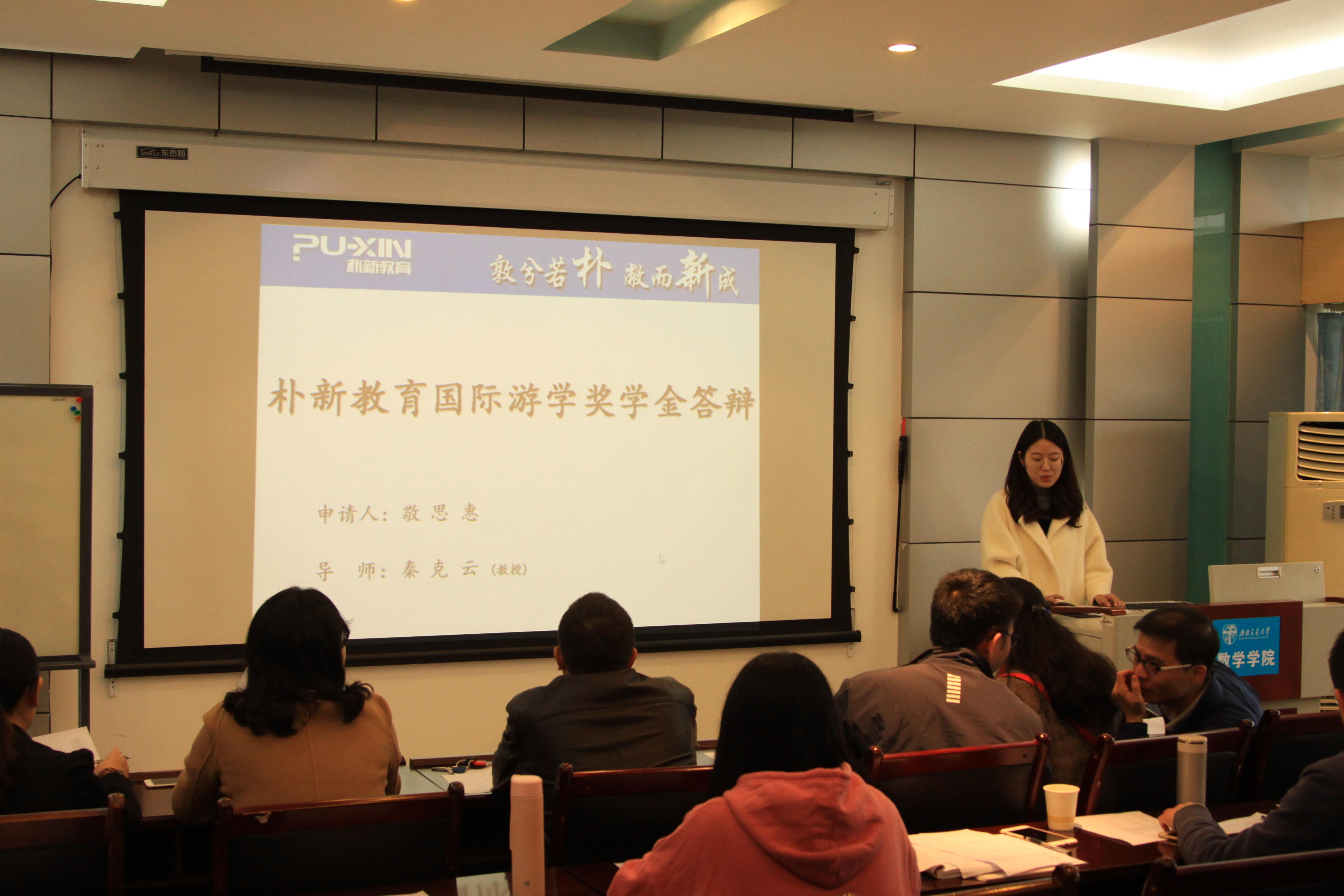 接下来,进行的是朴新教育国际游学奖学金的答辩,答辩人阐述了自己对于出国游学的看法,也表达了自己出国游学的目的,希望自己能够在游学期间拓宽眼界,提升格局,把握时代契机,为振兴交大献出属于自己的力量。