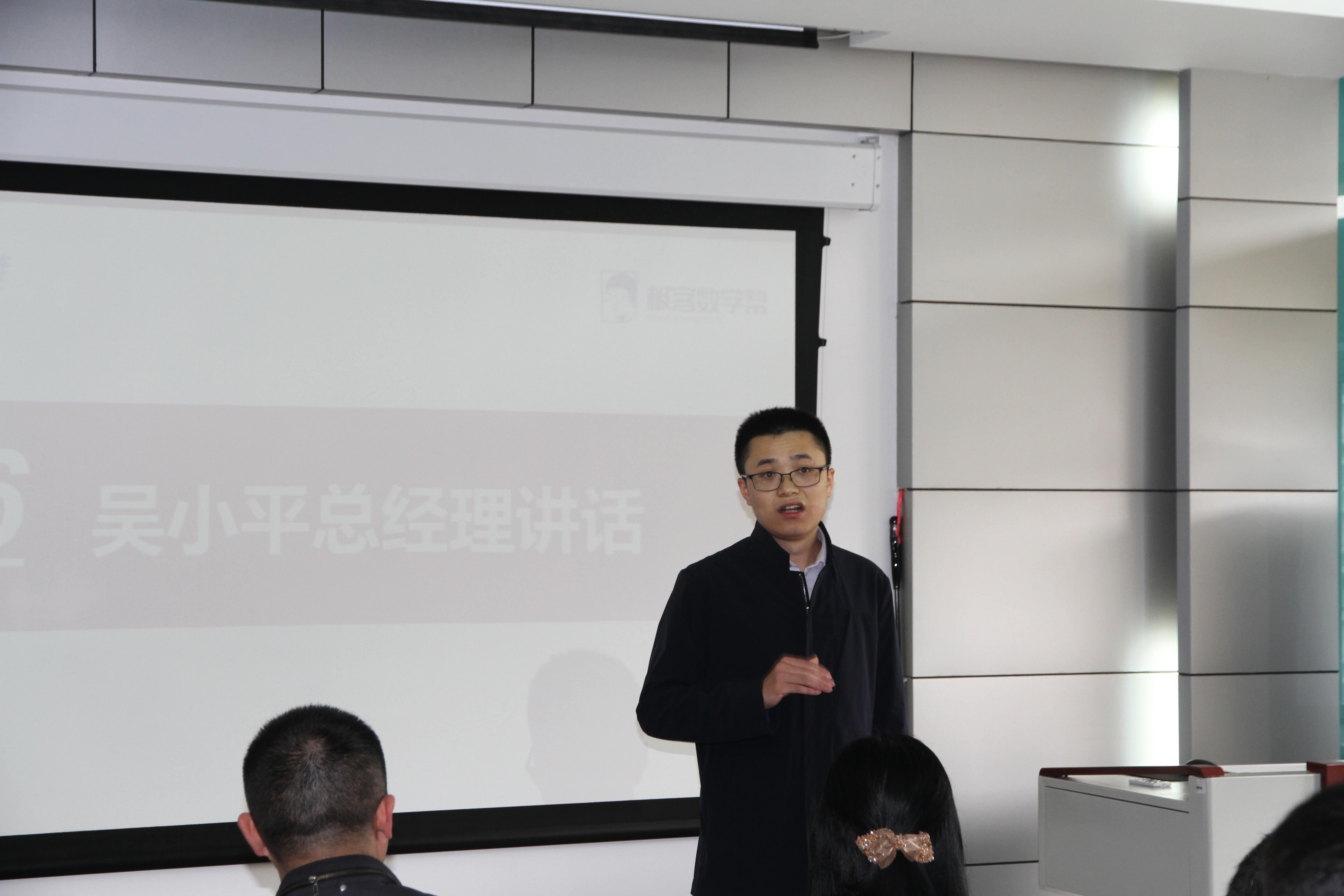在此之后极客未来教育科技有限公司总经理吴小平先生代表极客数学帮进行了讲话,吴经理首先祝贺了获奖学子,对学校和学院老师们的辛苦付出和栽培表示感谢,之后便向在场的同学们详细介绍了极客数学帮并指出其与网飞猫