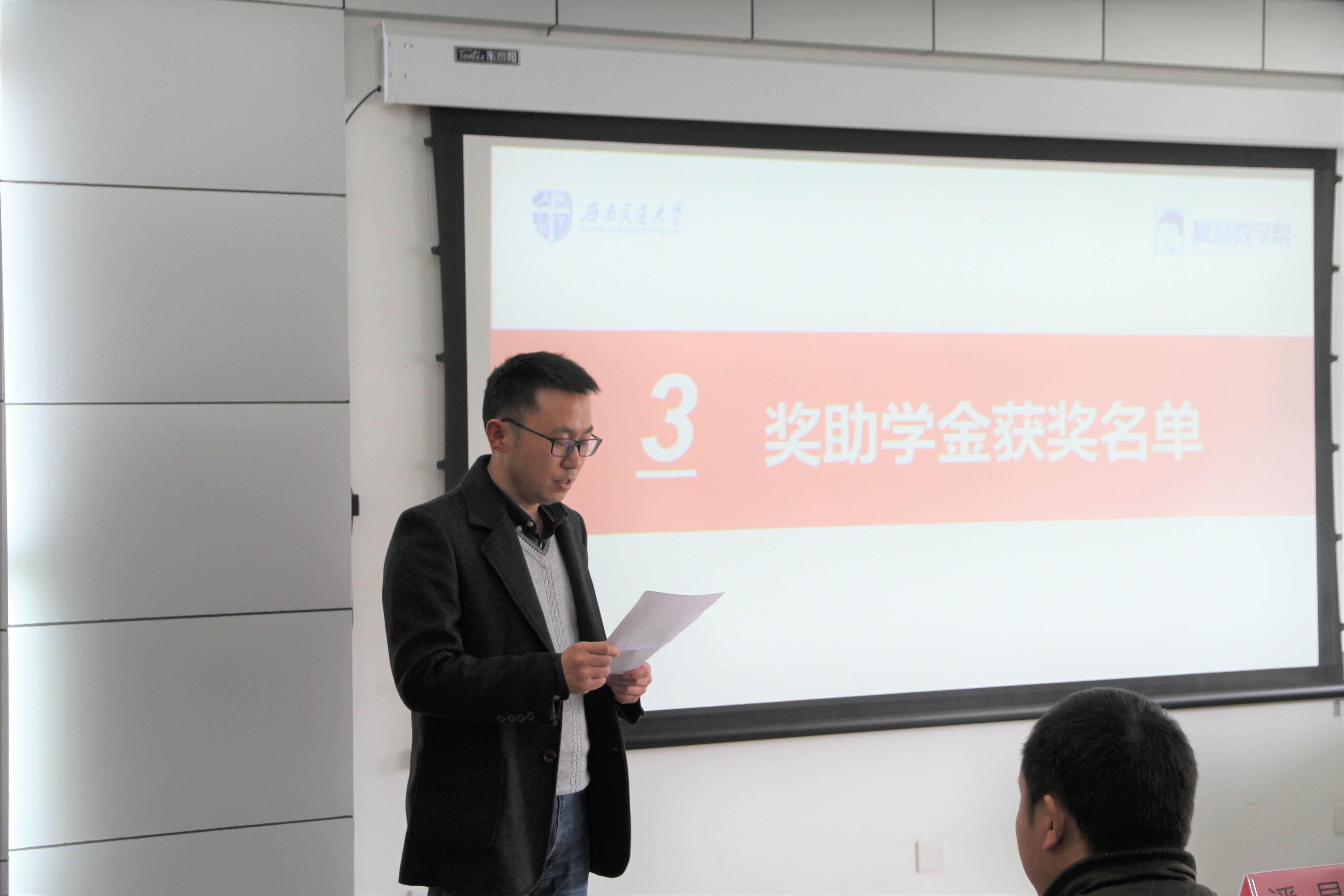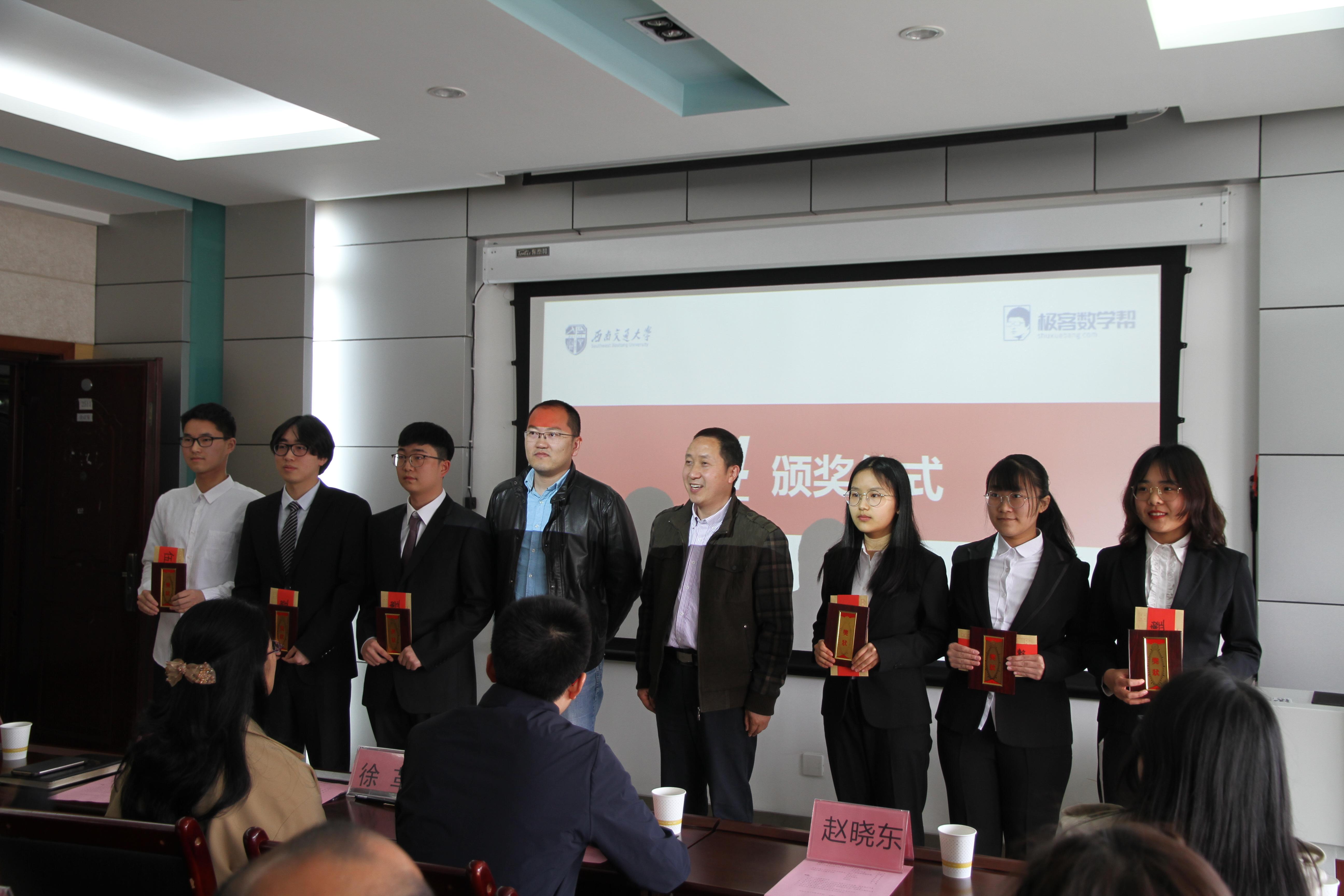 2017—2018学年“极客数学帮奖助学金”获奖名单并简单介绍了该奖学金评选的流程,继而由赵晓东总监和杨晗常务副院长为获得该奖助学金的同学们颁奖。