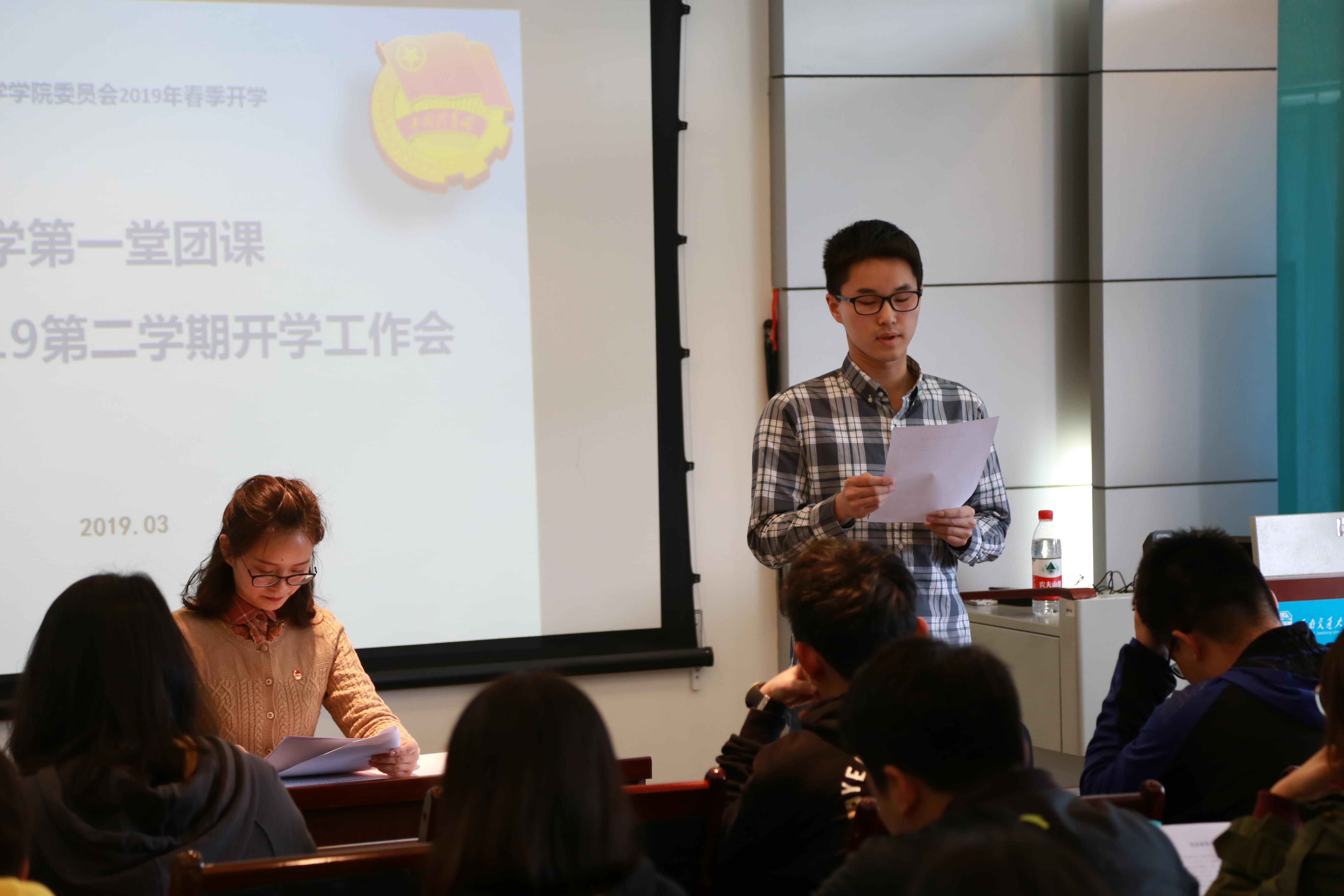 团委书记邓思然老师主持,学工组钟义婷老师、谢童心老师、各大学生组织负责人及各班团干部出席本次会议。