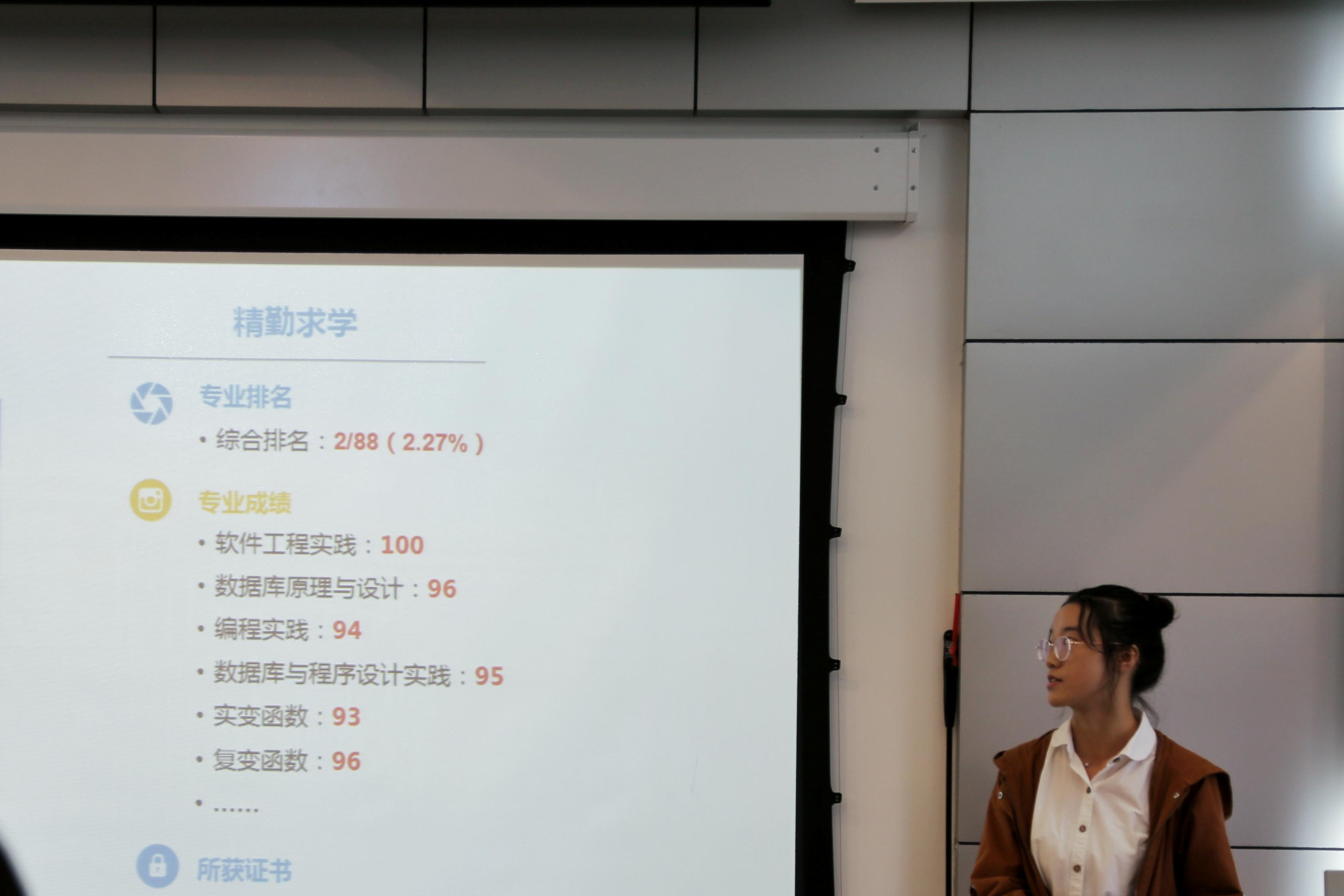 随后,优秀研究生王亚孟上台进行展示。“学有所成,学有所用,学以致用。”她用自己的优秀经历印证了这句话,向数院同学们分享自我经验与感悟,传达知识的力量。