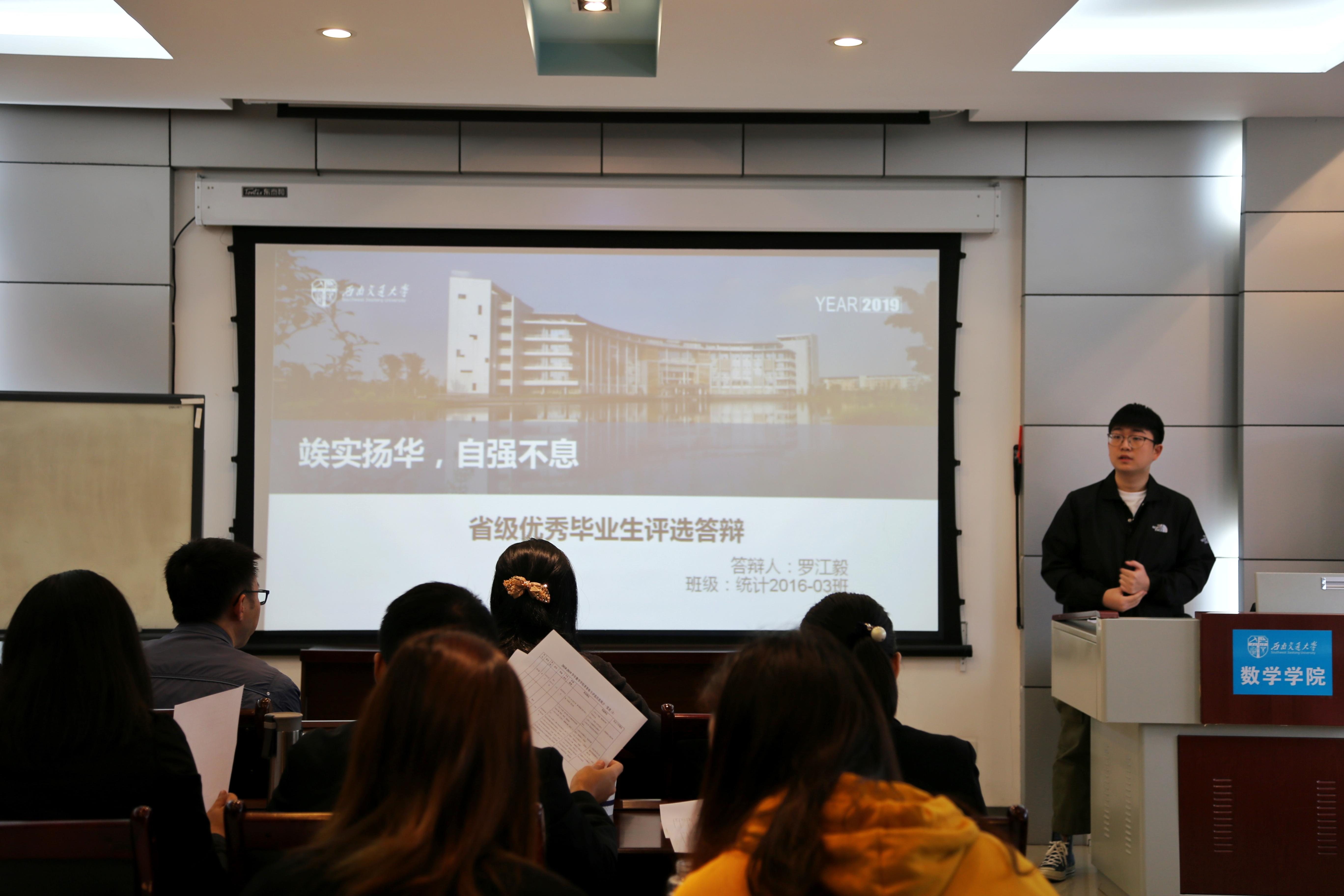 紧接着进行的是省级优秀本科毕业生的答辩。由罗江毅,周小兰两位同学上台答辩。两位同学均以优异成绩获得保研资格,除学业成绩,他们还在科研竞赛、学生工作、社会实践等多方面全方位地展现了自我,充分体现了交大数学人“竢实扬华,自强不息”的精神,为各年级同学做出优秀榜样!