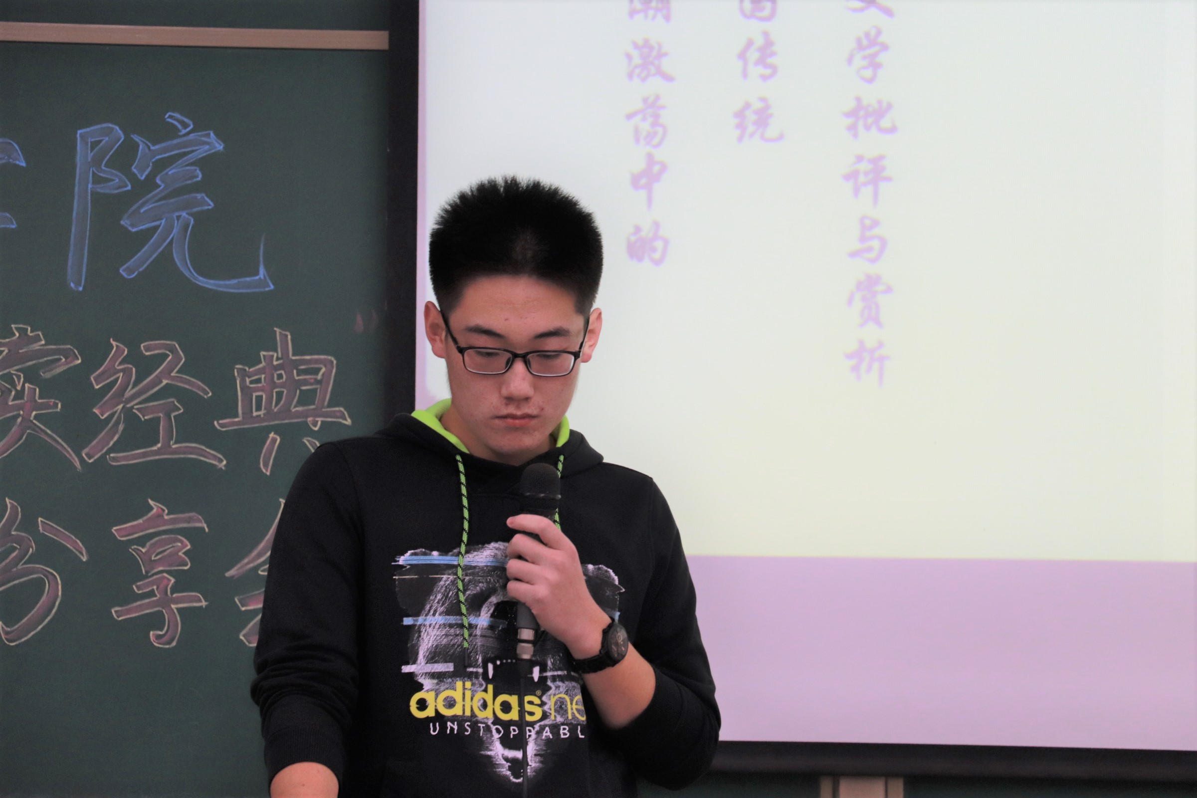 团委书记邓思然发表讲话。邓思然书记指出:读经典好书,与时代同行。本次活动旨在提倡同学们阅读经典,读有所学、读有所获。在丰富同学们课余文化生活的同时,在学院形成“多读书、读好书、好读书”的良好氛围。大学生读书需要有正确的态度,较高的定位,形成读好书的学习意识和提高处理繁杂信息的辨识能力,从而具备批判反思的创新精神。最后,邓思然书记建议同学们把“读、写、思、创”结合起来,把理论知识和现实遇到的困难联系起来。