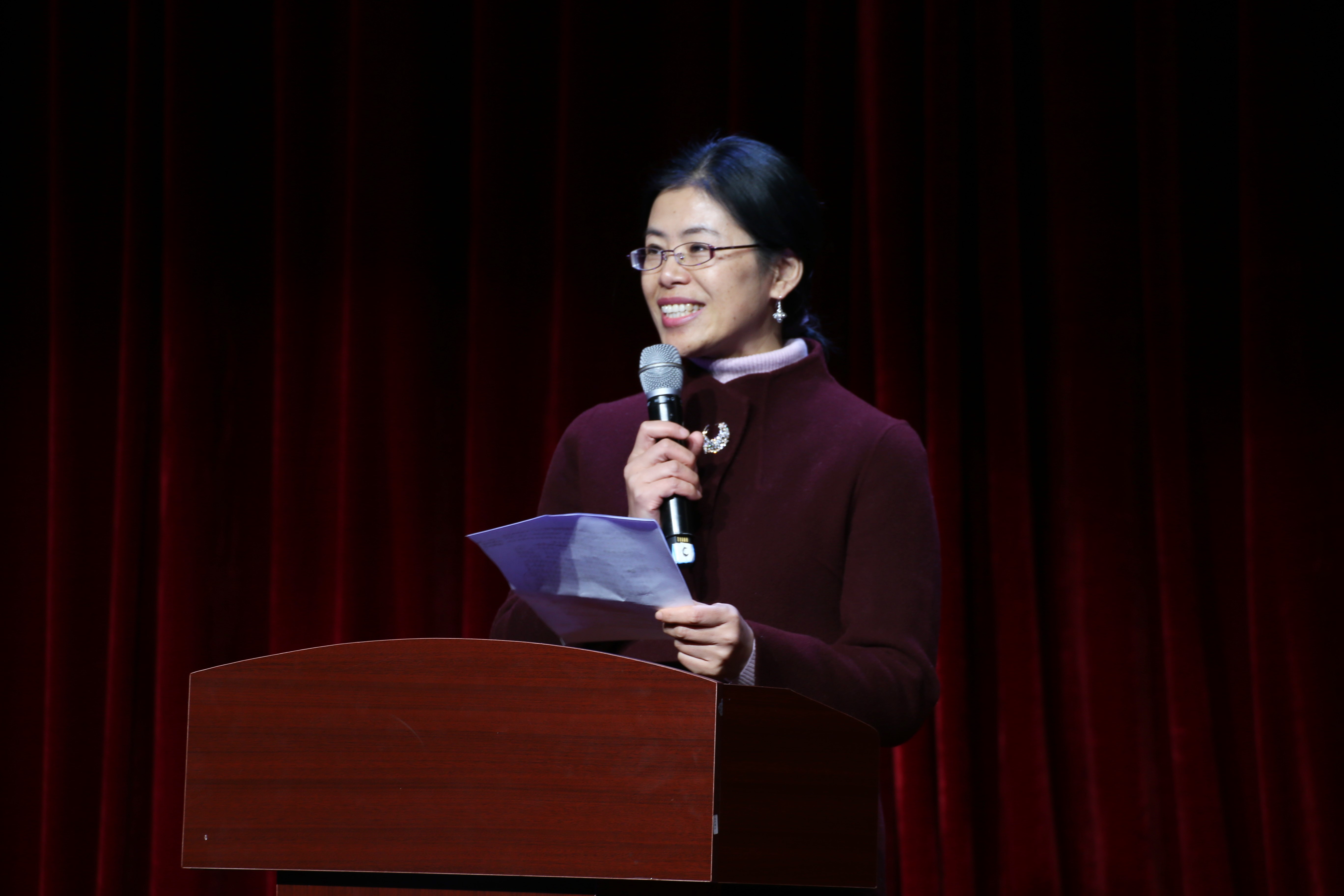 党委书记徐革教授为迎新晚会致辞。徐书记首先对支持本场晚会的老师同学们表示了感谢,同时也阐述了“一见倾心,终数于你”这一主题的意义。接着,徐革书记总结了2019年学院取得的丰硕成果,从奖学金荣誉称号、科研竞赛到社会实践、出国就业,学院的每一位师生都同心共力,取得了突出的成绩。徐书记特别提到,荣获“竢实扬华奖章”的周小兰同学,是全体数院同学学习的榜样;苗浩冉、汪立言两位同学取得了全国大学生数学竞赛的决赛资格,这也是网飞猫