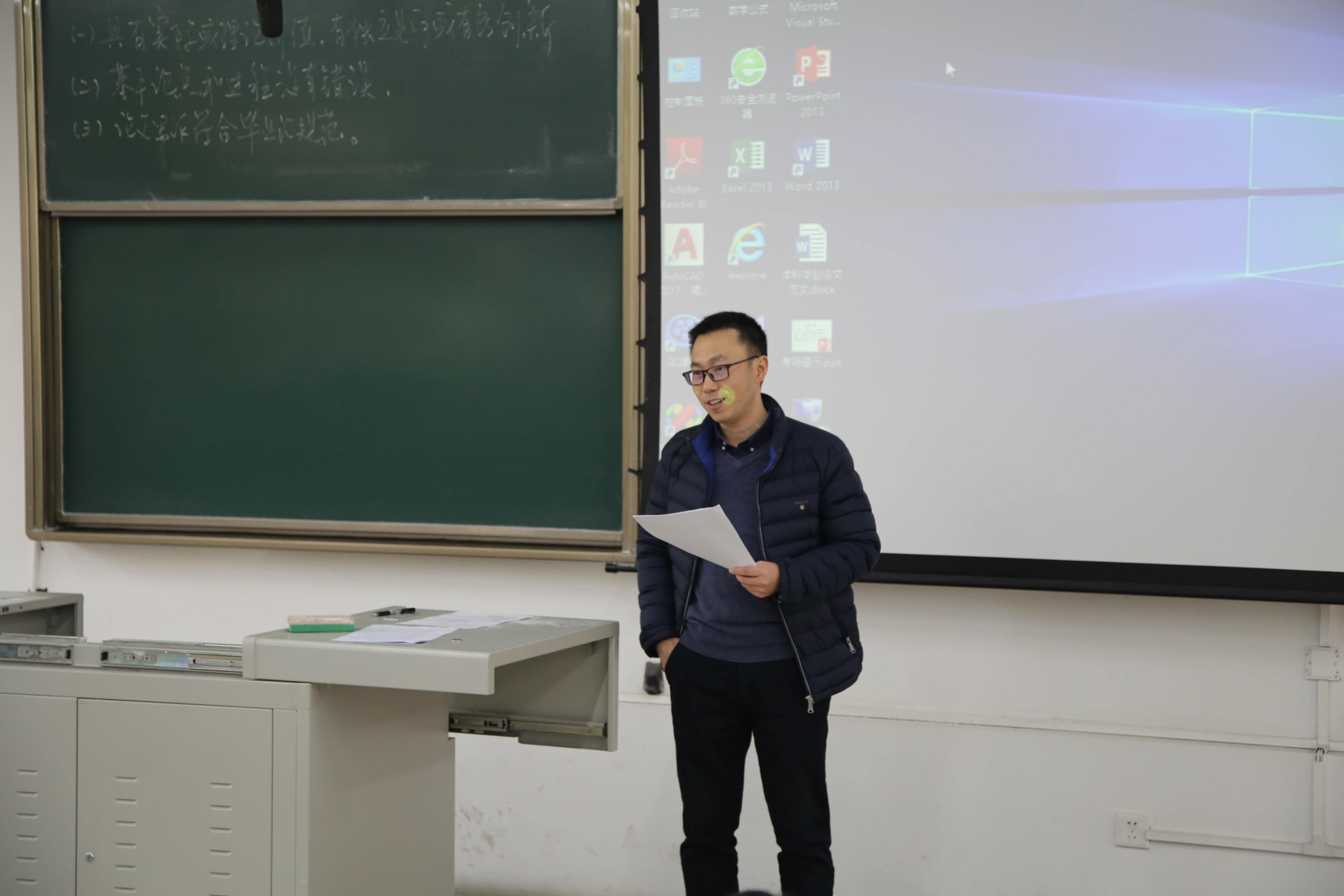首先,潘小东副院长向同学们指出了毕业设计的目的并强调了它的重要意义在于“作为考察学生所学成果的重要依据”。接着,潘院长向大家介绍了完成毕业论文设计的请假制度,而后又着重强调了毕业论文的文献检索、调查研究和资料搜索的重要意义。在论文内容方面,潘院长明确论文的格式,并提出毕业设计应该具有实际或理论价值,有独立见解或有所创新、基本论点和过程没有错误和论文写作符合毕业规范三个基本要求。最后,潘院长告知大四同学们毕业设计的时间安排并耐心解答了同学们关于毕业设计的疑问。