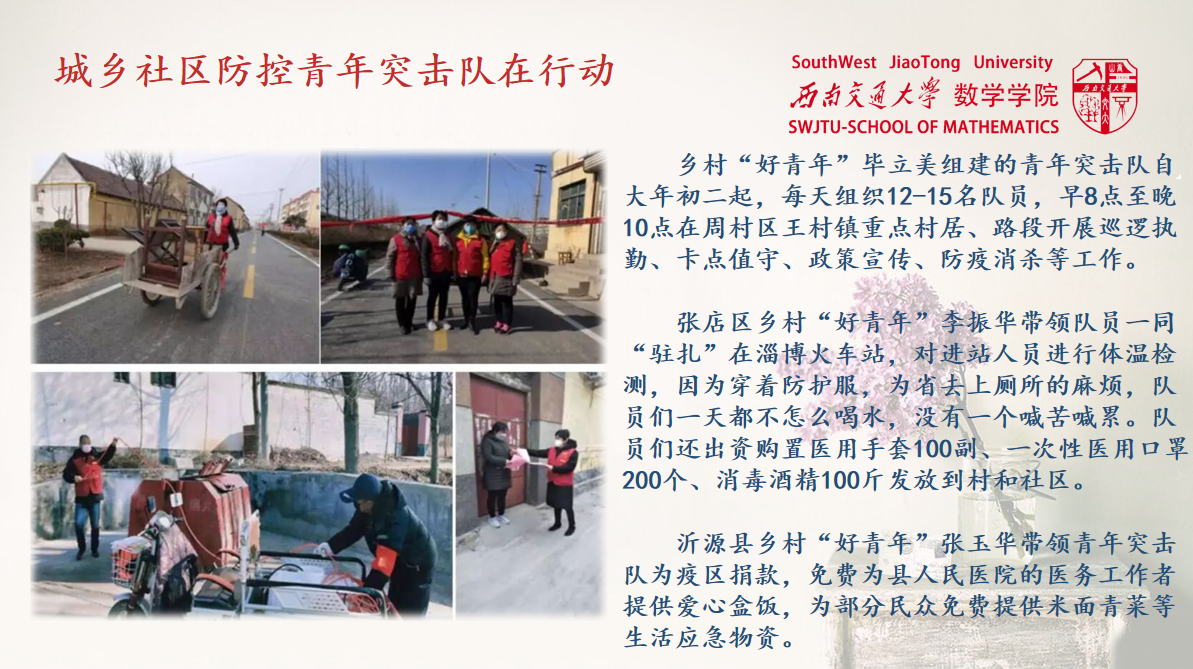 学生健康状况信息采集系统的填报以外,学院发起了针对“新型冠状病毒肺炎疫情”的捐款,号召我们献出爱心。数院团员同样积极参与抗疫志愿者活动,米贤惠就是其中一员。他们与社区工作人员一起走访各个社区,进行登记人员信息等工作,为打赢疫情阻击战贡献自己的青春力量。