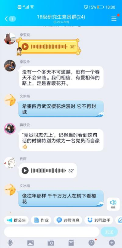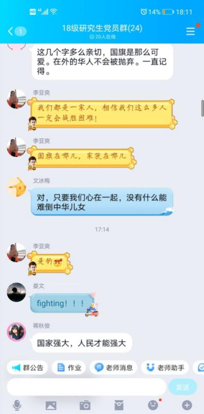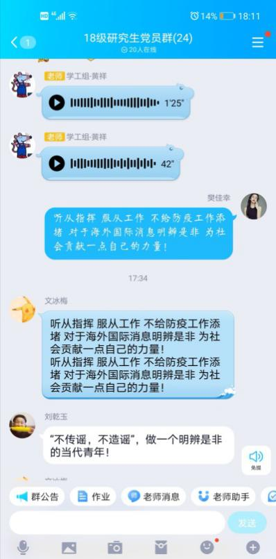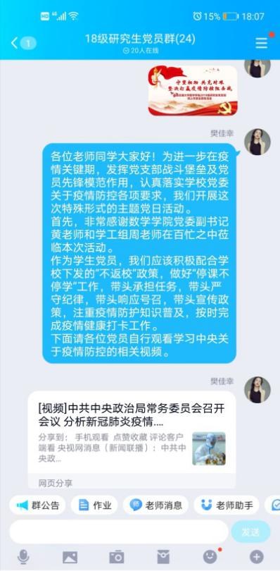 2018级研究生党支部召开疫情防控线上主题党日活动。本次活动以“守望相助,共克时艰,坚决打赢疫情防控阻击战”为主题,依托QQ群聊平台开展,网飞猫