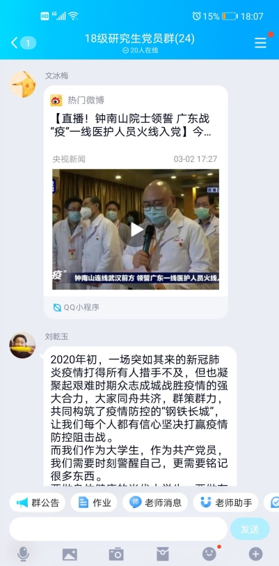 随后,全体党员结合视频及会议主题发表了自己的看法。宣传委员文冰梅推送了关于“钟南山院士领誓,广东战‘疫情’一线医护人员火线入党”的视频,她强调:“党中央对这次疫情防控及时有效的措施对我们来说是个强心剂。”组织委员蒋秋俊表示:“在这次疫情中,各级党员都坚守在抗疫一线,牢固增强“四个意识”、坚定“四个自信”、做到“两个维护”、坚决服从安排,全力以赴做好防疫工作,充分发扬了党员的带头作用。”党员李亚爽,预备党员夏丹、刘乾玉则鼓励大家说:“我们相信中国人民齐心协力的力量,我们也相信祖国的专家团队能够快速攻克病毒难关,我们的难关终将过去,因为没有什么能把我们炎黄子孙打倒!我们是最棒的!”