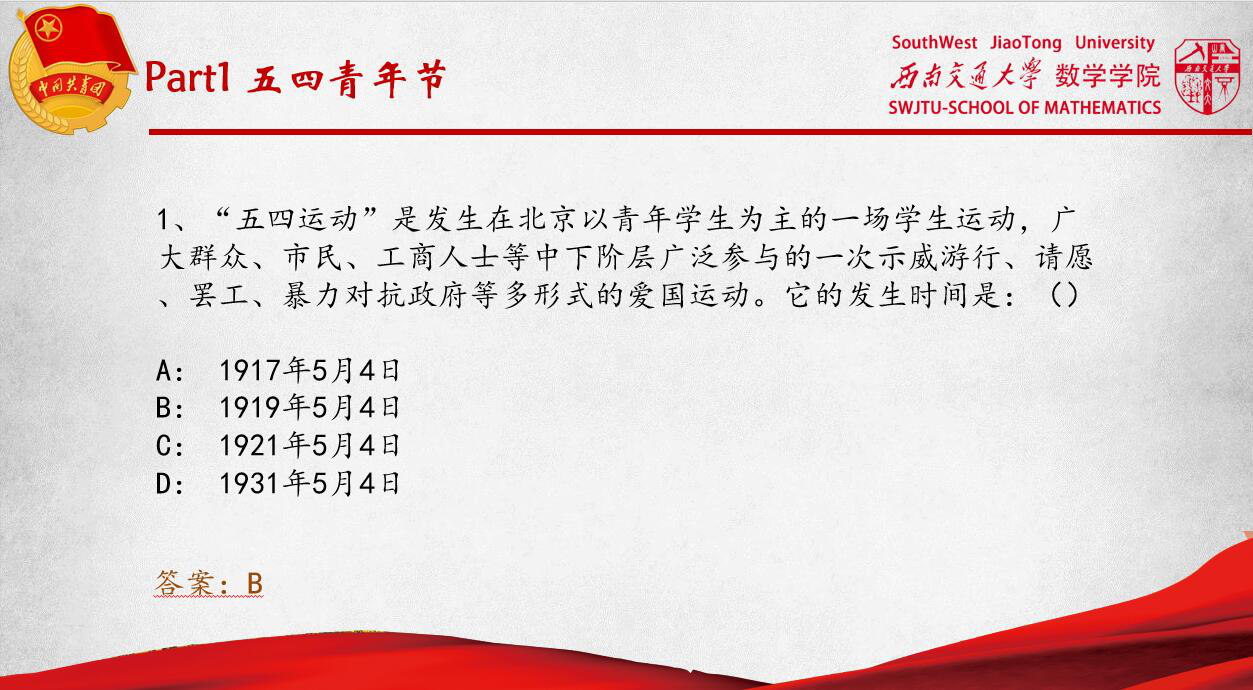 议程第四项,答题正式开始。题目共分为五部分,每部分十道题。第一部分为五四青年节的相关知识,旨在让我们更好地了解我们青年自己的节日。第二部分为党史国史的知识问答,作为共产主义青年团的一份子,了解团和党的历史是十分必要的。第三部分为团的知识,这部分内容帮助我们更好地认识了我们所处的团组织。第四部分为疫情相关问答,了解时事是每一个团员的本分,青年大学习对当下的疫情也进行了多期讲解,这一部分也是网上团课青年大学习的复习与回顾。最后一部分是校史知识问答,在了解交大那23年曲折漫长峥嵘岁月的过程中,承先辈之志,交大学子定会继往开来,用行动践行“竢实扬华,自强不息”的交大精神。