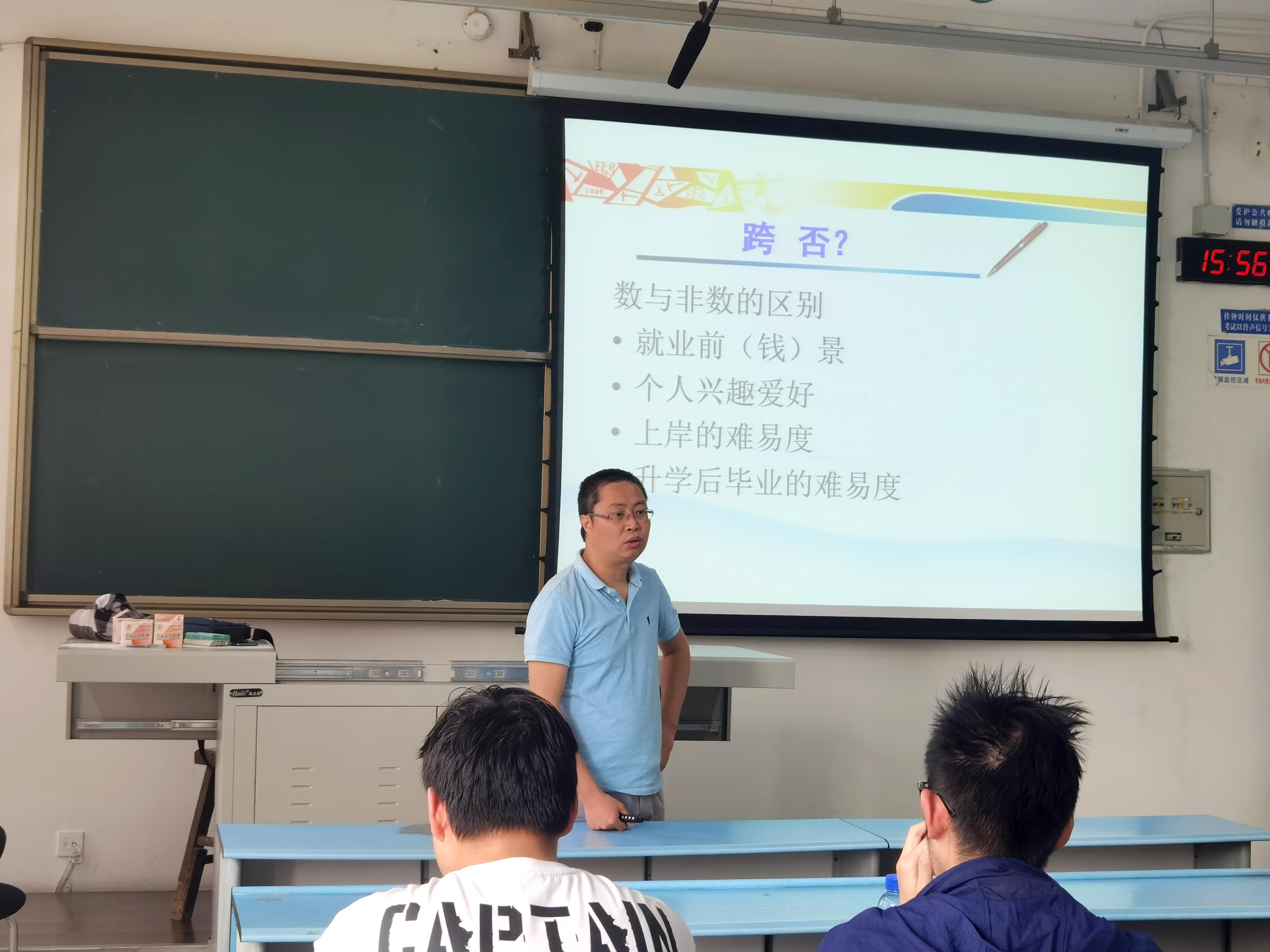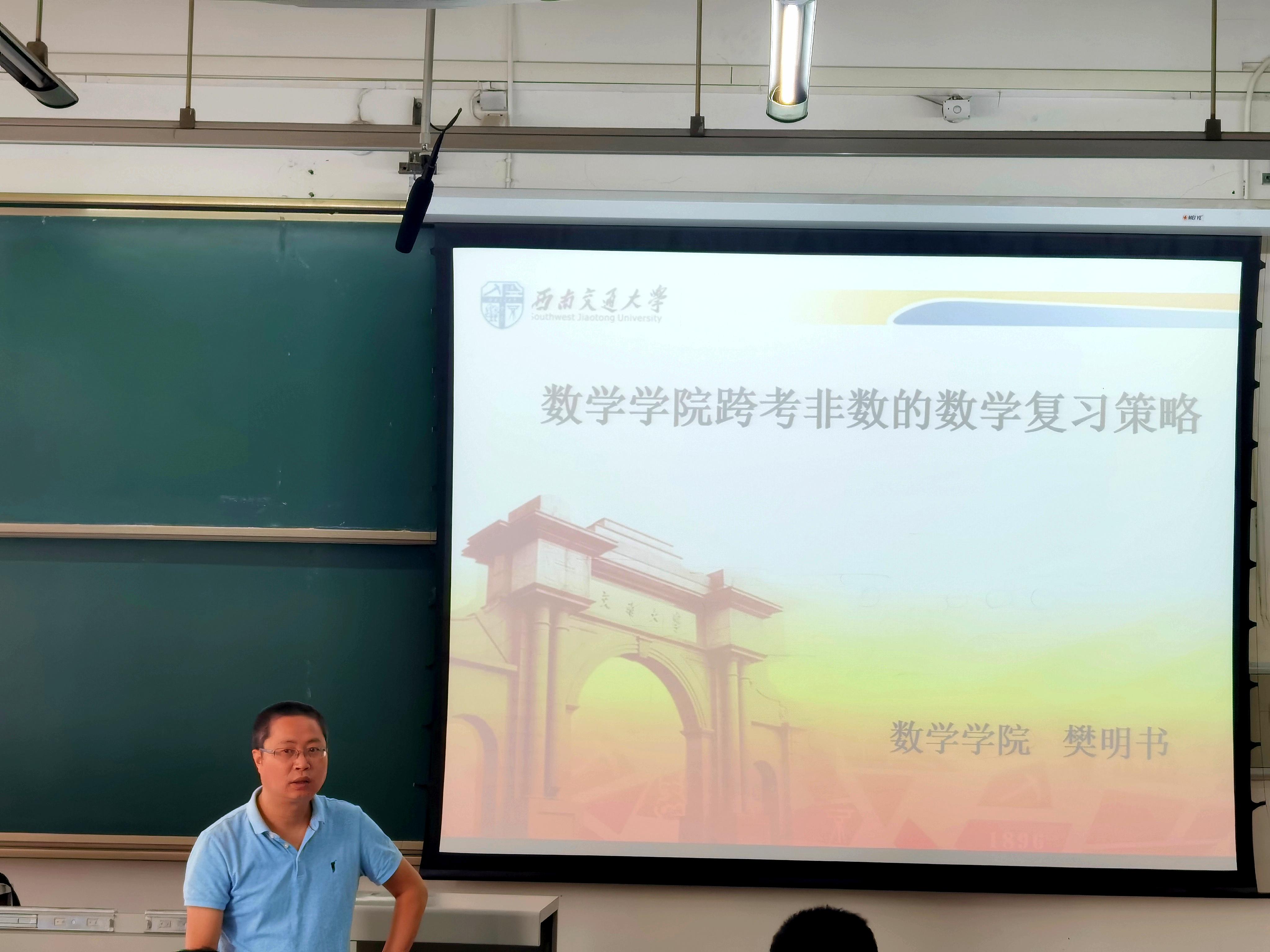 的学生跨考非数学专业的优势和劣势,并着重强调虽然数学专业的学生有扎实的数学基础和理论基础,但是这容易使学生产生心理误区和复习资料选择误区,并可能会导致复习方式上出现错误。他建议同学们一定要客观进行选择,在复习时应多做多练,同时学会观察他人的错误并以此来进行自我检查,从而得到提升。之后,樊明书老师分别介绍了升学的三大途径,同时还鼓励各位同学以积极的心态学习数学。讲座最后为提问环节,同学们积极地向樊明书老师提出了各自的问题,老师也认真耐心地为同学们解答疑难,提出建议。