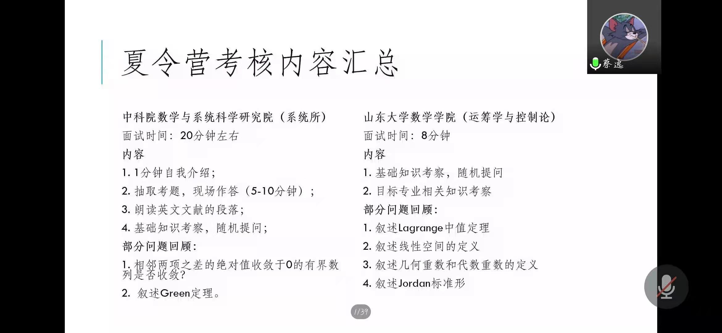 最后是保研至厦门大学的蔡逸同学带来的分享。他强调了保研阶段重要的时间节点,并详细介绍了三个批次的推免考核。他还给同学们提出了申请材料准备方面的建议,指出应当突出个人优势,并说明选择学校的理由及未来的发展方向。他还指出同学们应当在等待结果的过程中,抓紧专业课程的复习与梳理。针对自己的夏令营经历,蔡逸同学也向同学们进行了分享,他介绍了各个学校面试阶段的不同流程,并对面试过程中导师所提部分问题进行了回顾介绍。