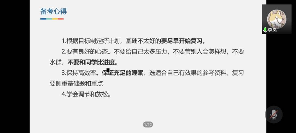 李岚学长发言结束后,王政慧学姐紧接着分享自己的经验。 王政慧学姐分享了自己备考时的规划,对自己考研时的四个科目依次提出自己的复习安排,给出了自己备考时的时间安排,从大致的每段时间的安排到每天对每个科目的具体安排,让我们对考研时的作息计划有了一个更好的了解。接着王政慧学姐分享了自己备考时遇到的困难,从生活上的到心理上的,以及最后考研成功之后的感概,让大家深有感触。
