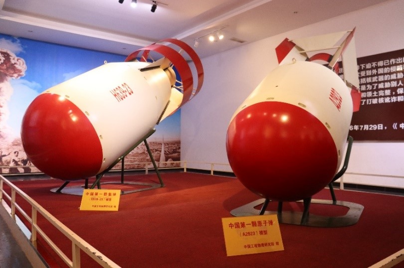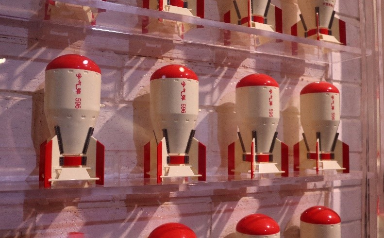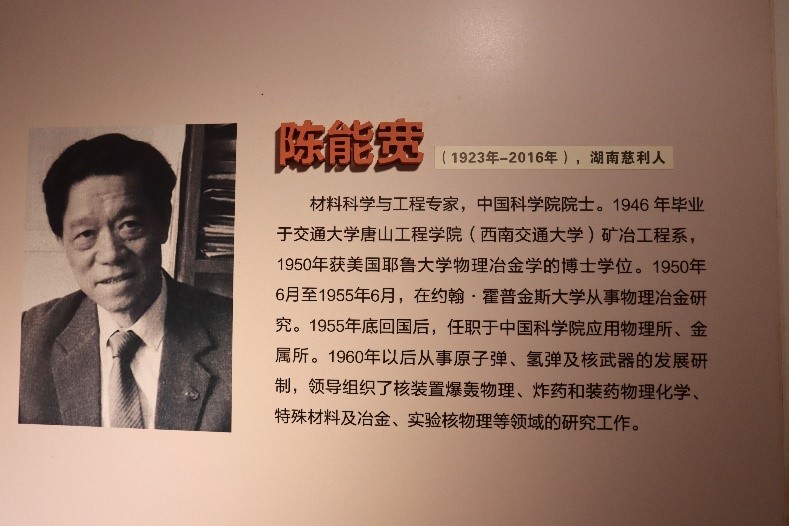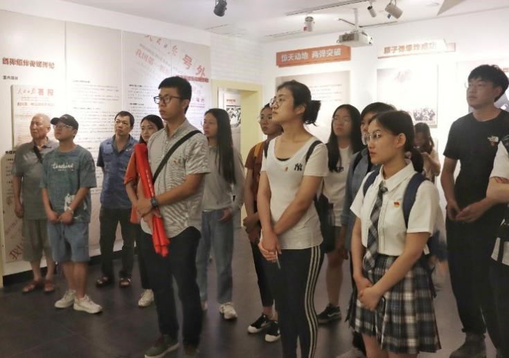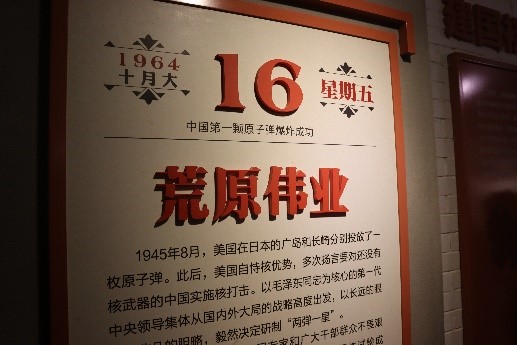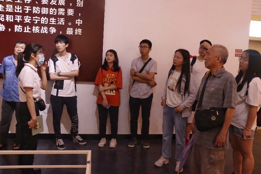 校友陈能宽为代表的一系列两弹杰出人才,他们都曾默默奋战在两弹城这个鲜为人知的地方,怀揣拳拳赤子报国心奉献于惊天动地的事业。场馆利用声光电等手段,通过实物、模型、影像资料等方式,向学院师生展现着“两弹”研制工作的艰辛历程。最后,师生们参观了两弹模型。讲解员介绍道:“这是我国第一颗核航弹的模型,长3米,直径1.5米左右,后面就是它爆炸所产生的蘑菇云。”师生们伴随着讲解,近距离感受科学家为两弹事业所做的伟大贡献。