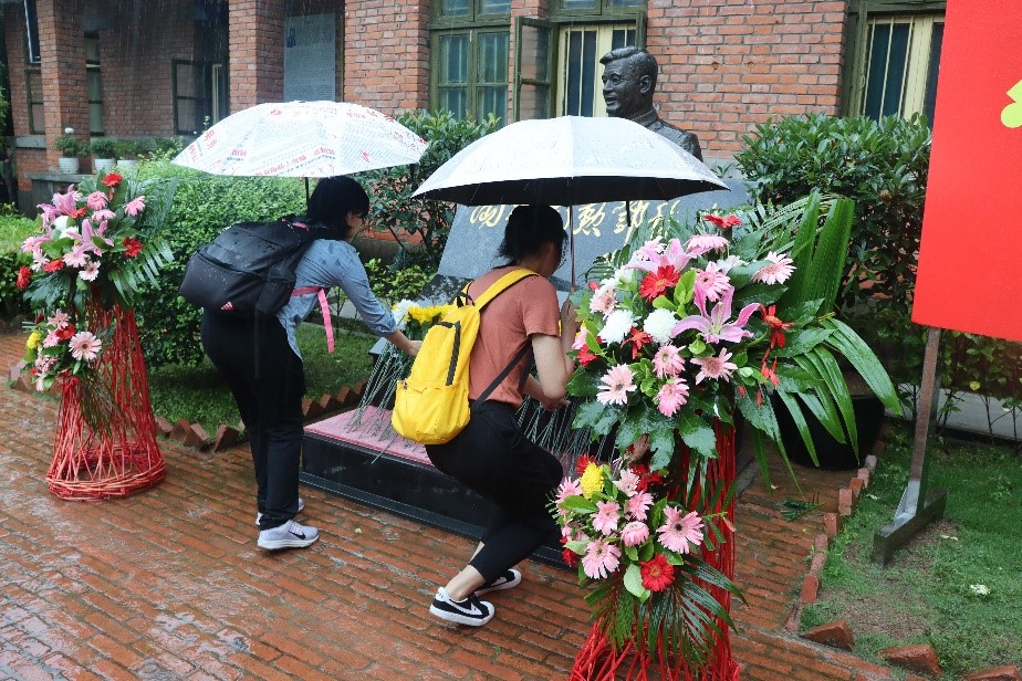 随后,师生们前往邓稼先旧居进行参观。两室一厅的平房,一片香樟和梧桐林,这便是邓稼先曾经的住处。简朴居室的墙上,挂有珍贵的历史资料照片与邓稼先的手稿复印件,展现了他当时丰富的内心世界。参观途中偶遇降雨,师生们在雨水中驻足,向邓稼先塑像致意,敬献花篮,完成献花仪式,向邓稼先表达崇高的敬意与怀念。