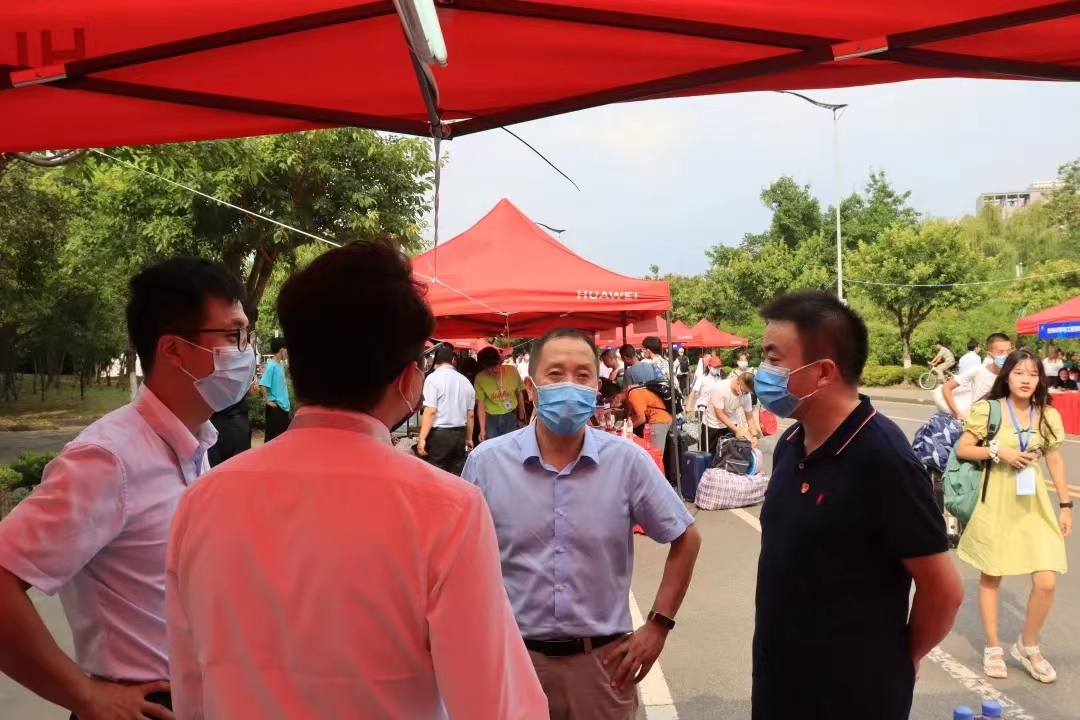 迎新点,亲切走访慰问迎新的师生、志愿者,深入了解学院迎新工作的开展情况并对学院的迎新工作给予高度评价。