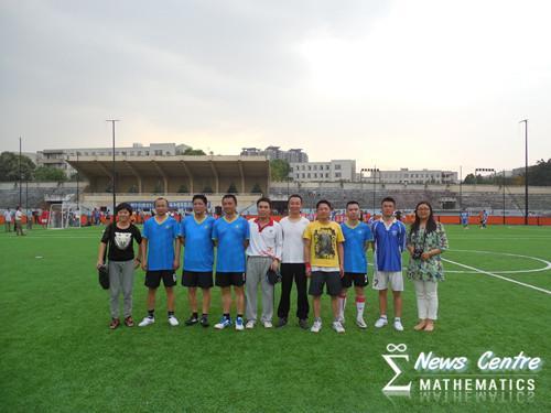 After four-round fierce games, the finals of 2015 Southwest Jiaotong University Faculty Five-men Soccer Competition arrives on 17th April. At 17:00 sharp, the spectacular rivalry between the School of Mathematics and the School of Geosciences and Environmental Engineering kicked off. Special concentrations were attached to the game. Accompanied by the Secretary of Youth League Committee, instructor for the students of 2012 Xu Haijing, Deputy Party Secretary Li Zhihui not only cheered for the athletes, but also joined in the latter half of the match, fighting shoulder-to-shoulder with the teachers from the School of Mathematics.