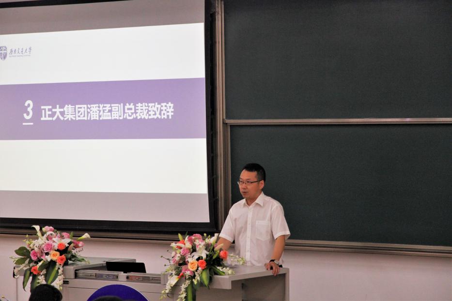 开幕式第二项,由正大集团潘猛副总裁代表企业方致辞,潘猛副总裁向大家简单介绍了正大集团的网飞猫-网飞猫官方最新私密爆料站以及“人才第一、以人为本”的企业理念,鼓励同学们努力拼搏、力争上游,在本次比赛中取得优异成绩。